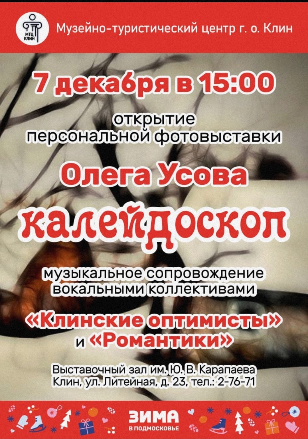 vasazav Новости 28.10.2025 28.10.2025 Музейно-туристический центр городского округа Клин приглашает ценителей искусства на торжественное открытие персональной фотовыставки Олега Усова «Калейдоскоп». Мероприятие состоится 7 декабря в 15:00 в Выставочном зале имени Ю. В. Карапаева. Поделиться:TwitterВКонтактеОдноклассникиGoogle
